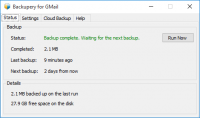 Backupery for Gmail is a desktop application designed to automate the backup process for Google Mail accounts. The software facilitates regular, scheduled snapshots of email data, exporting messages to several types of storage destinations. Users can configure the application to save archives directly to a local computer directory, external hard drives, Network Attached Storage (NAS) devices, USB flash drives, or network shares. Additionally, the service supports integration with third-party cloud storage providers, including Google Drive, Dropbox, and Microsoft OneDrive.