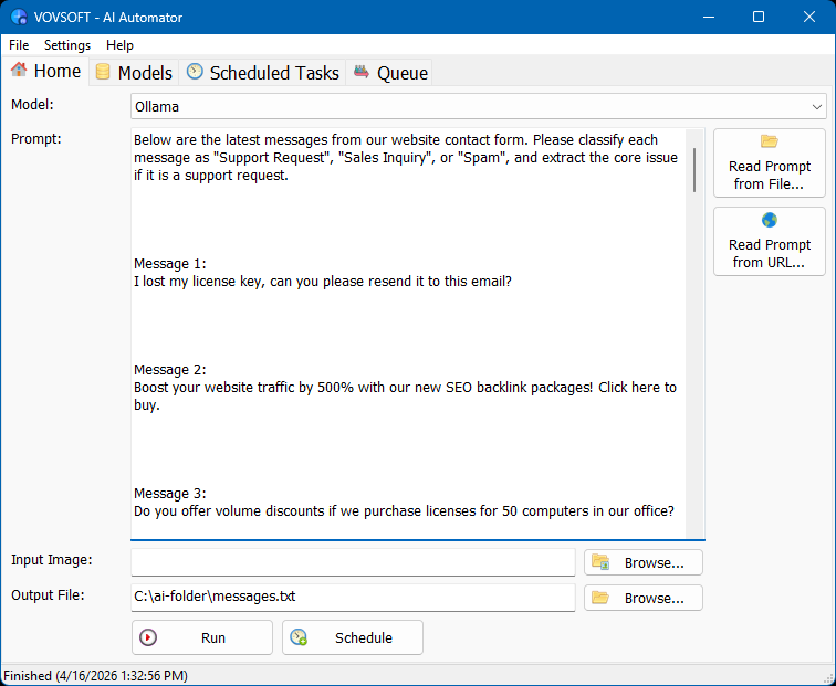 The software can read prompt from external sources, giving you full flexibility in how you define your AI queries. Supported input methods include: