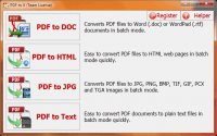 PDF to X is used to convert PDF documents to Word (.doc)/WordPad (.rtf) documents, HTML web pages, JPG/PNG/BMP/TIF/GIF/PCX/TGA images and plain text files in batch mode. It works without Adobe Acrobat or Adobe Reader, and has friendly interface, small size, accurate and fast conversion ability.
